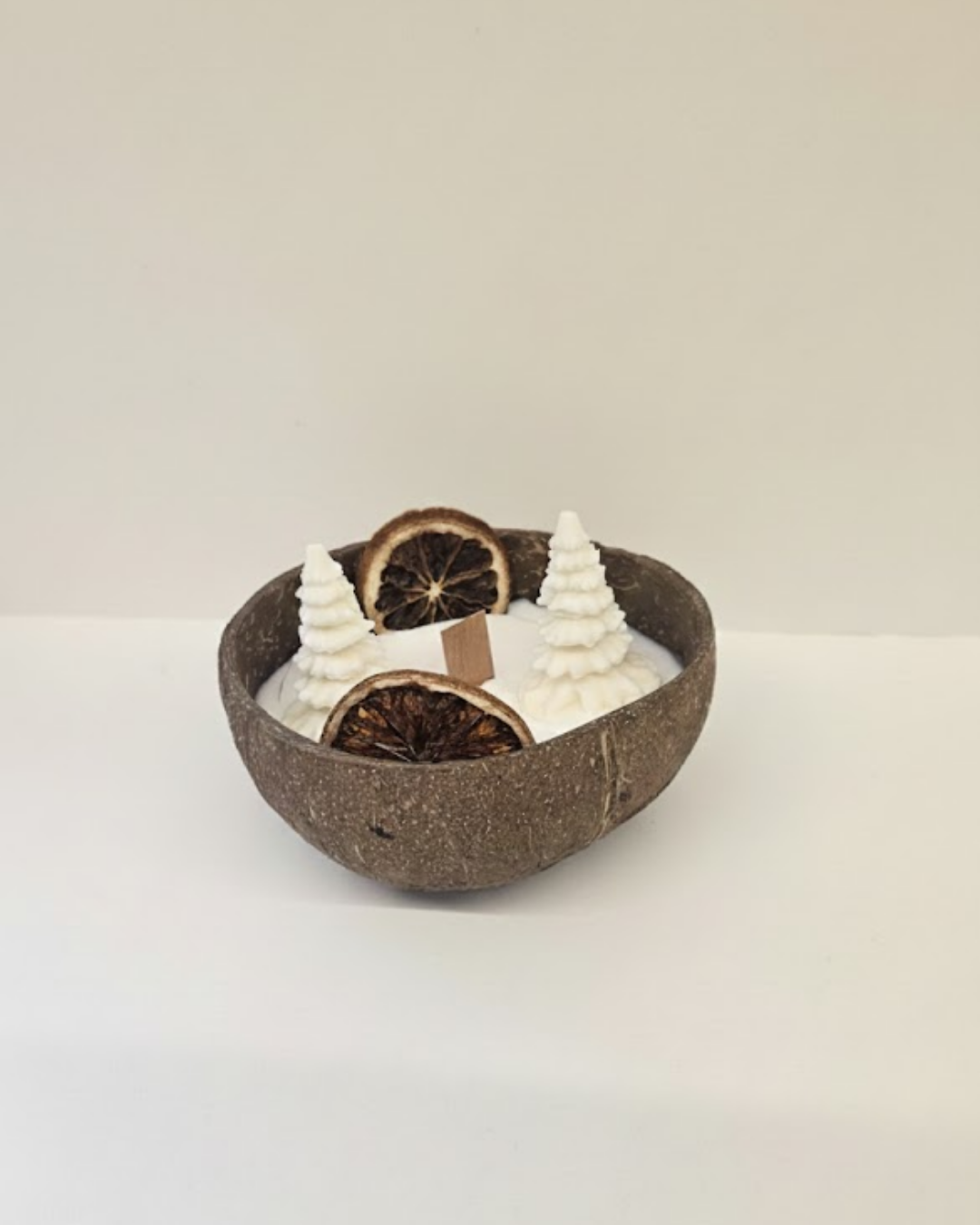 Esta vela artesanal se presenta en una auténtica cáscara de coco, creando un contraste rústico y elegante. En su interior esconde delicados abetos blancos de cera, convirtiéndose en el centro de mesa perfecto para estas fiestas.